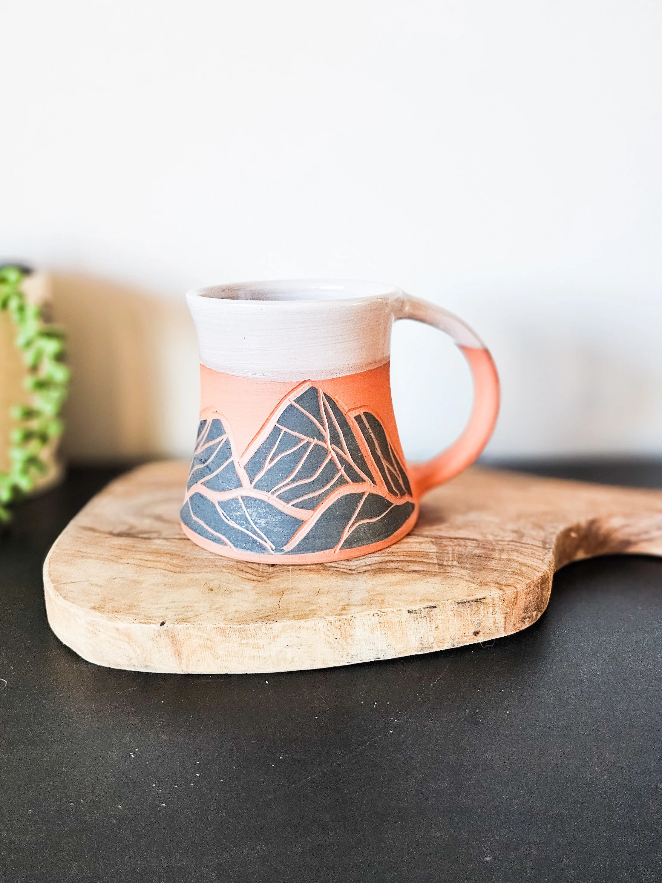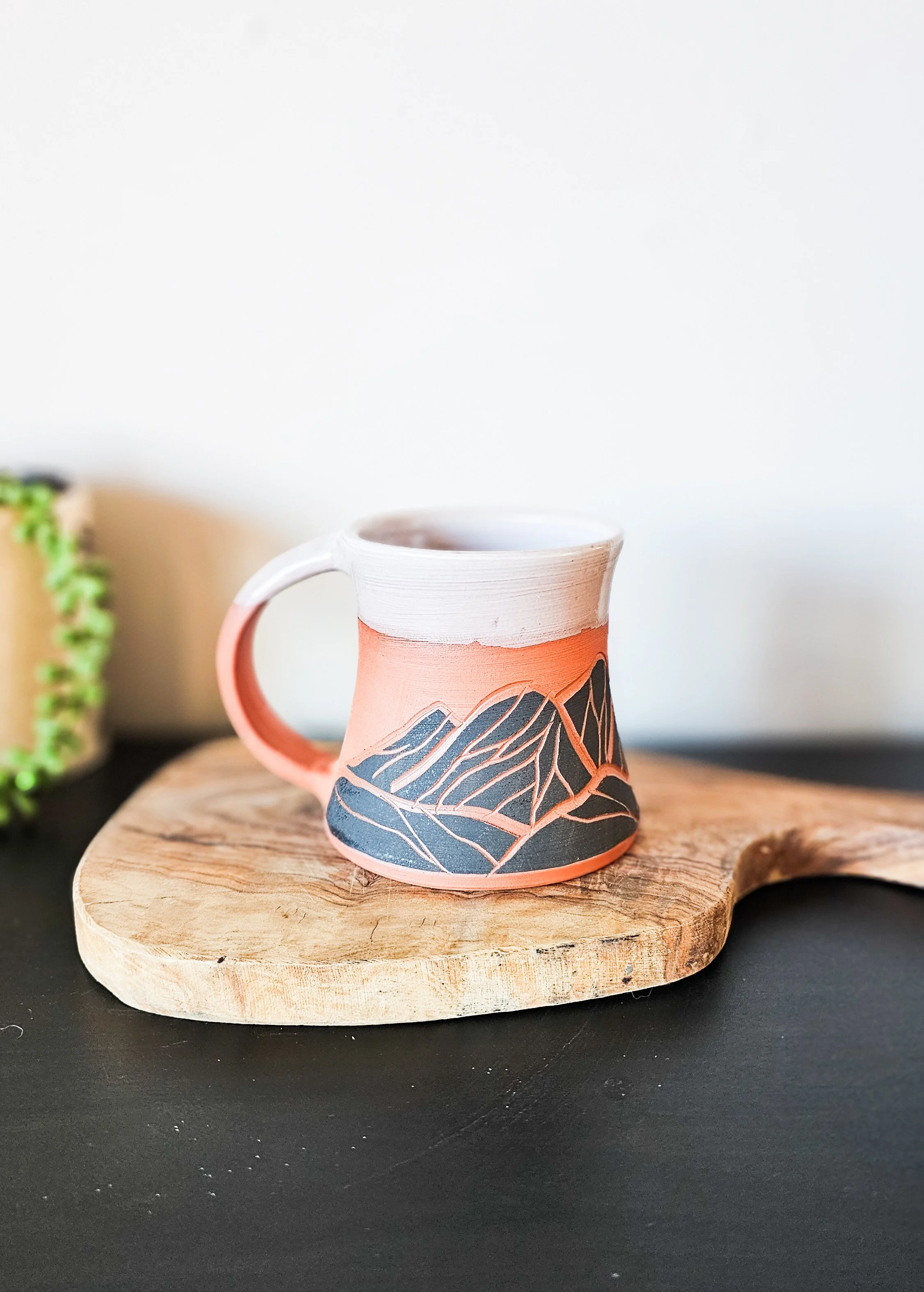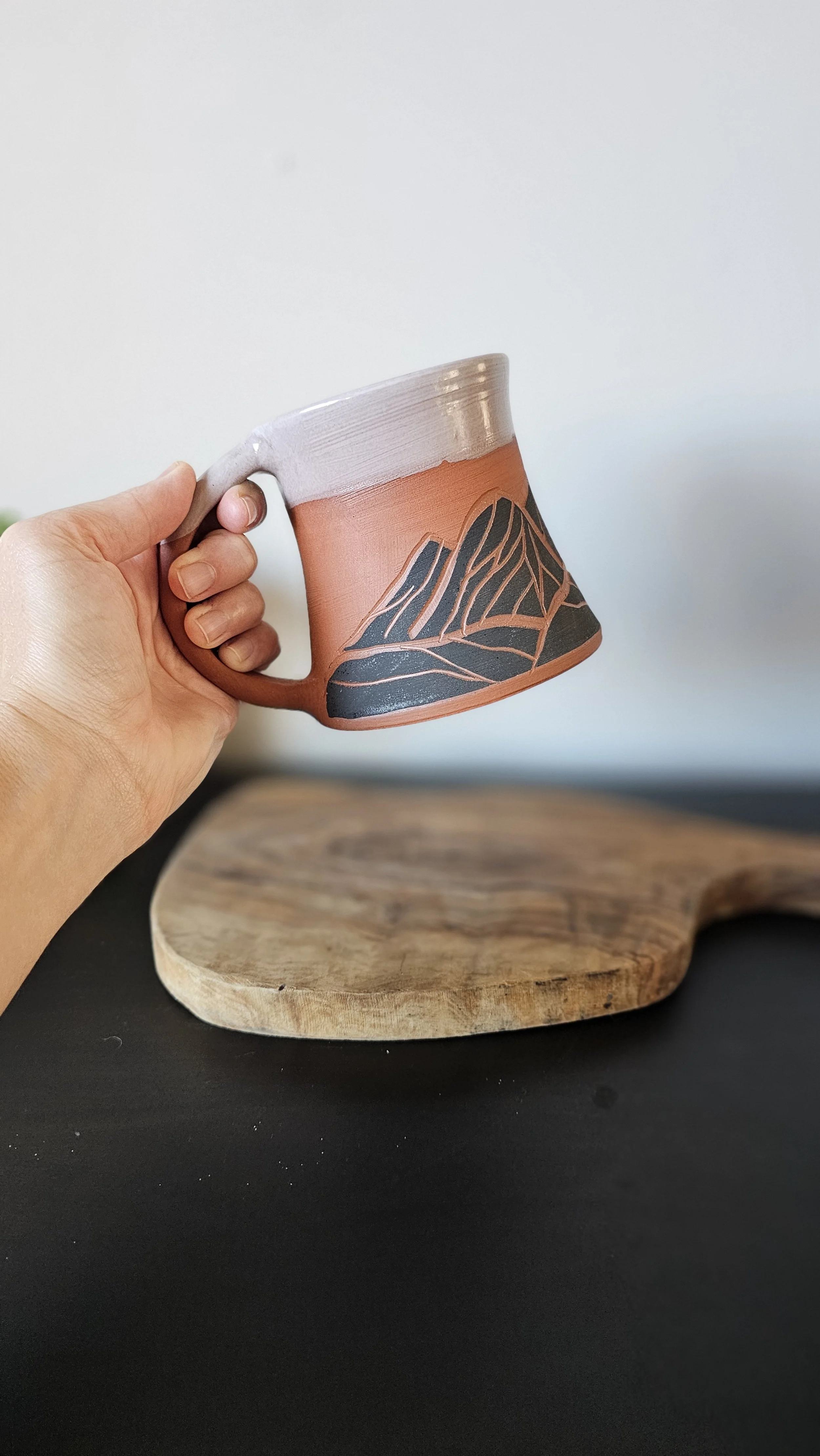 Crafted from beautiful red clay, this piece features hand-carved black mountain designs that add a striking contrast. The rim and interior are coated with a smooth white and grey glaze, enhancing both its aesthetic appeal.