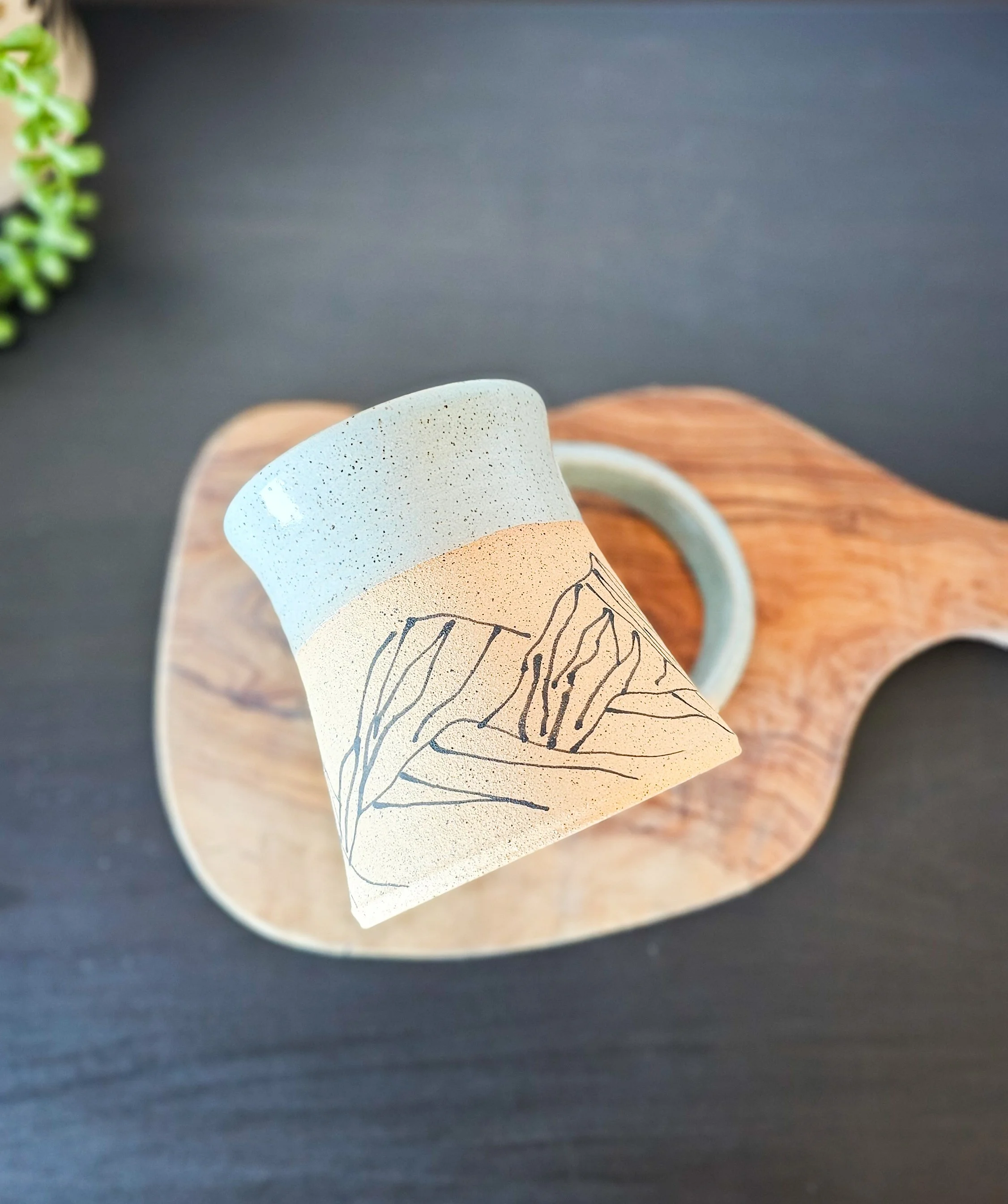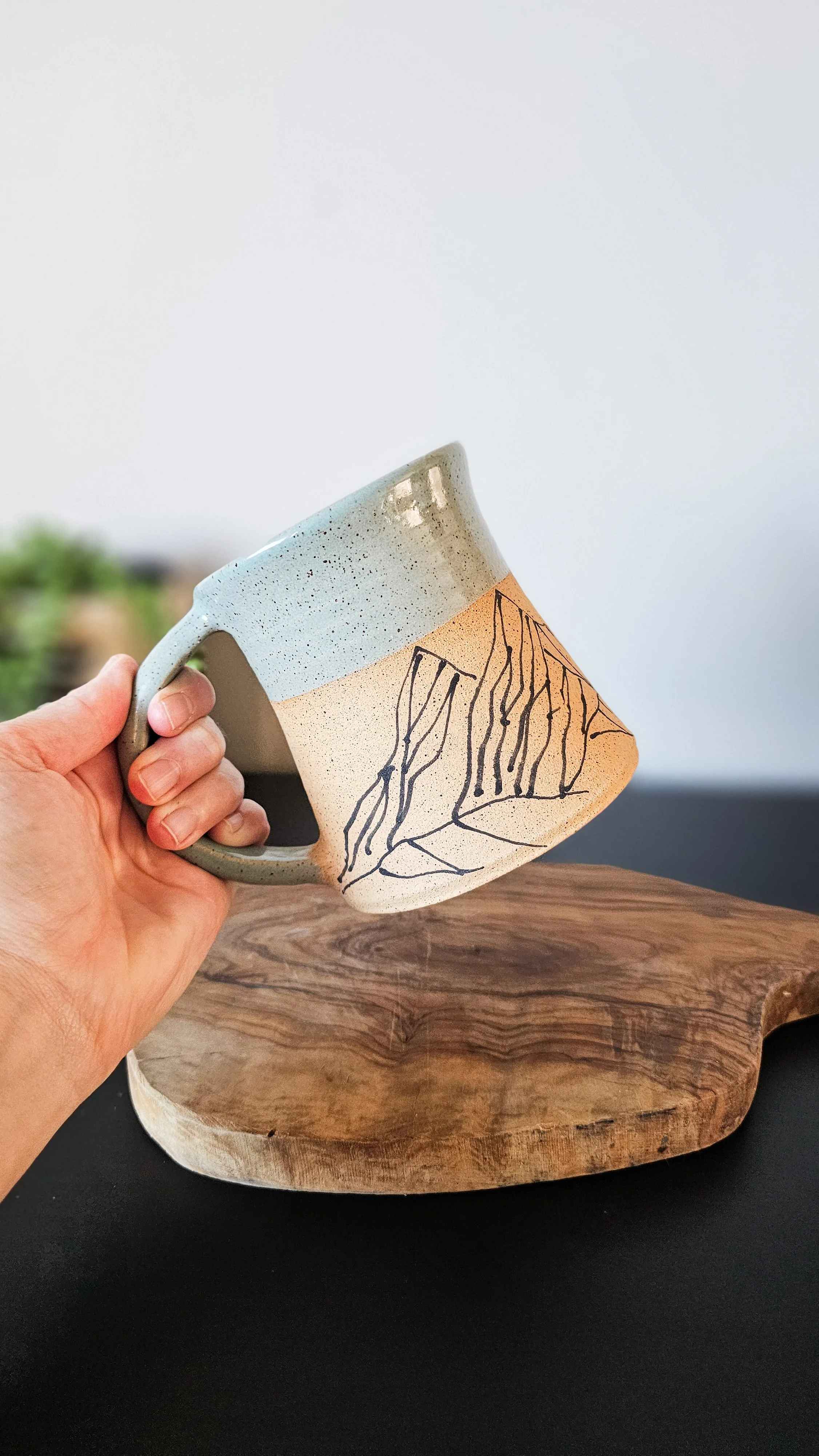 Speckled buff-colored clay featuring a carefully hand-painted mountain design. The interior and rim are finished with a smooth, light blue glaze that adds a subtle touch of color and elegance.