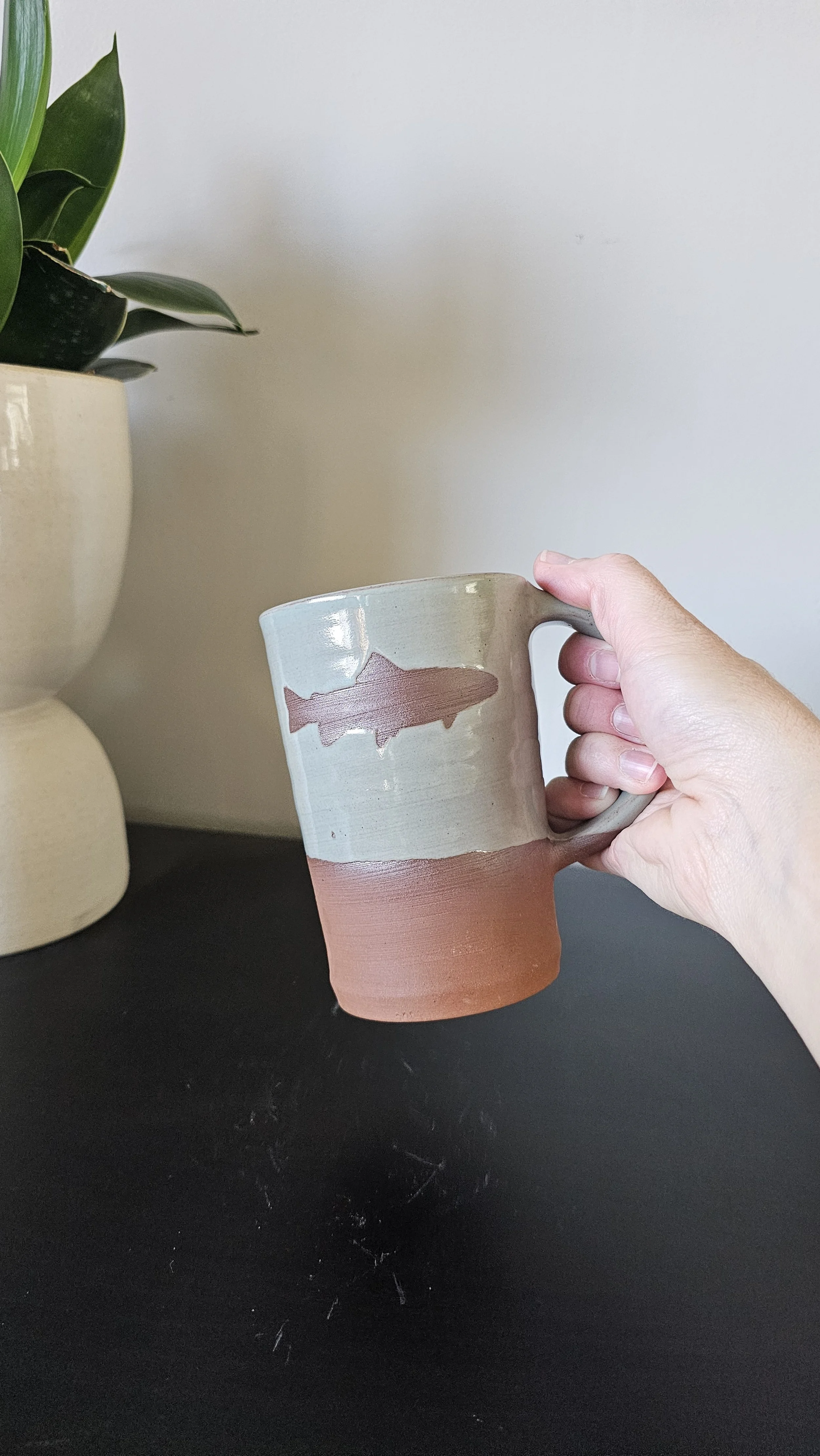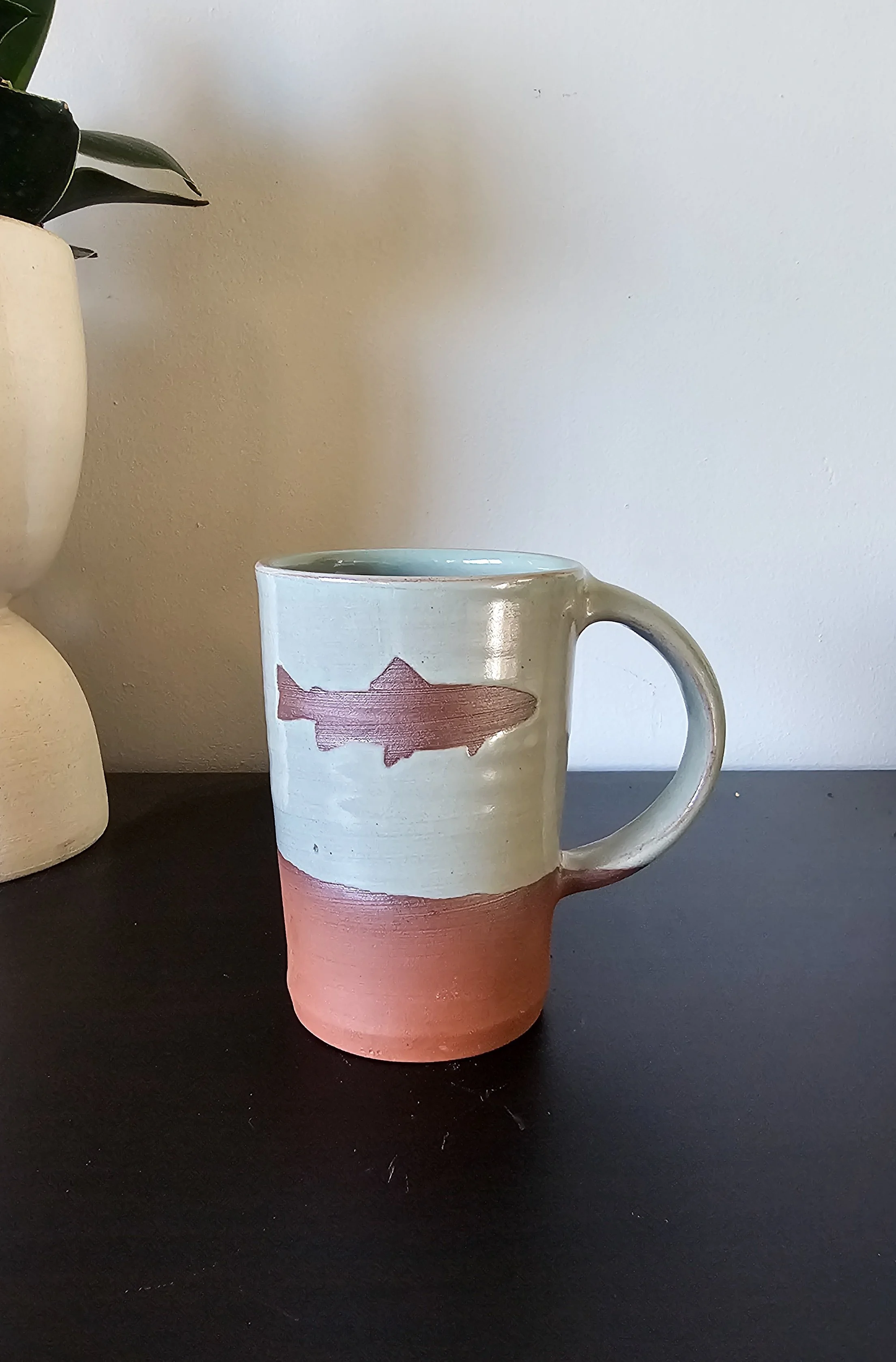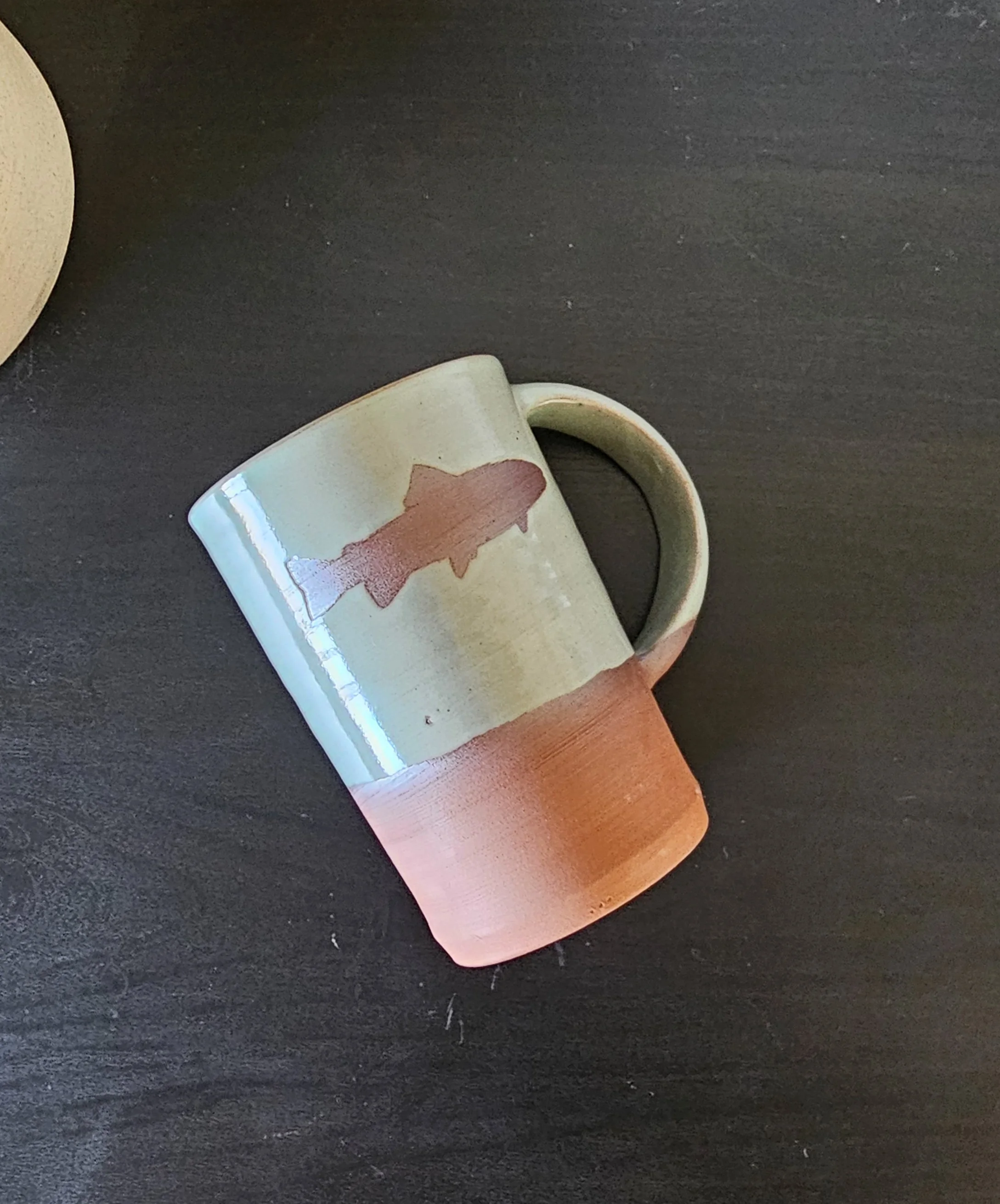 Here fishie fishie. This beautiful red clay piece features an intricate trout design that captures the essence of nature. The glaze is a stunning blue-green watery color, adding depth and a serene, flowing feel to the artwork.