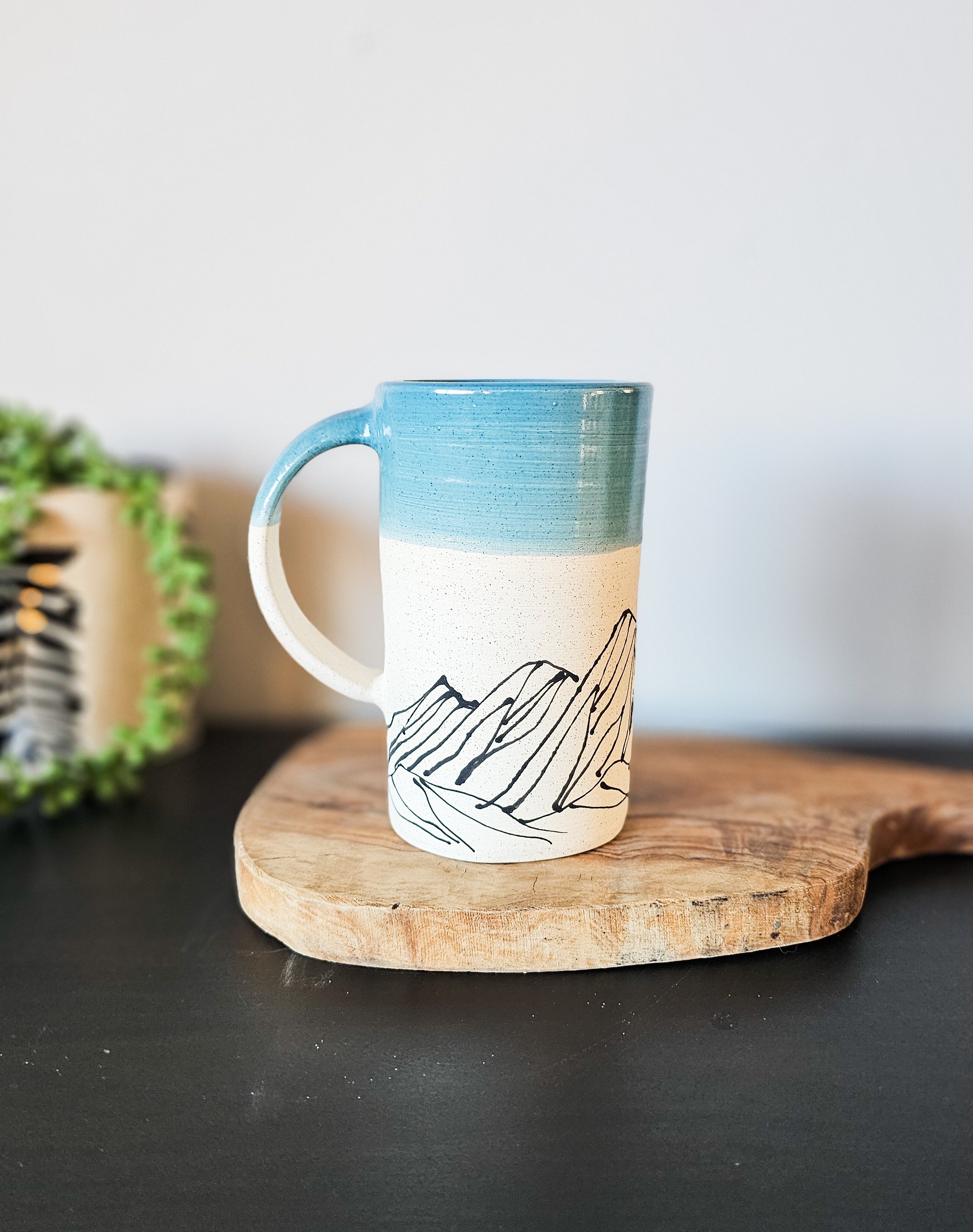 Tall hand-painted mountain mug, crafted with care and attention to detail. The interior and rim feature a beautiful sky blue glaze, adding a calming and serene touch to every sip.